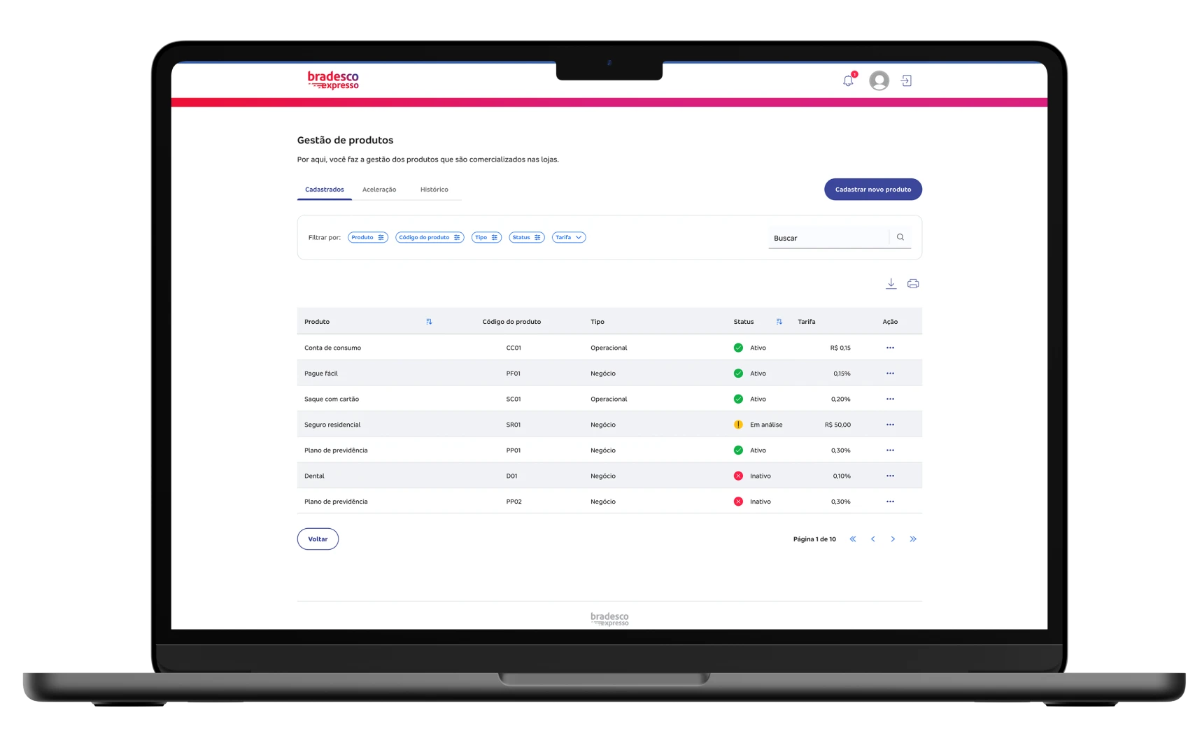 Outro foco importante foram as jornadas de gestão financeira: cadastros de serviços e tarifas, controle de receitas e acertos de pagamentos. Jornadas voltadas ao funcionário Bradesco, com atenção especial à apresentação de dados e gestão financeira.